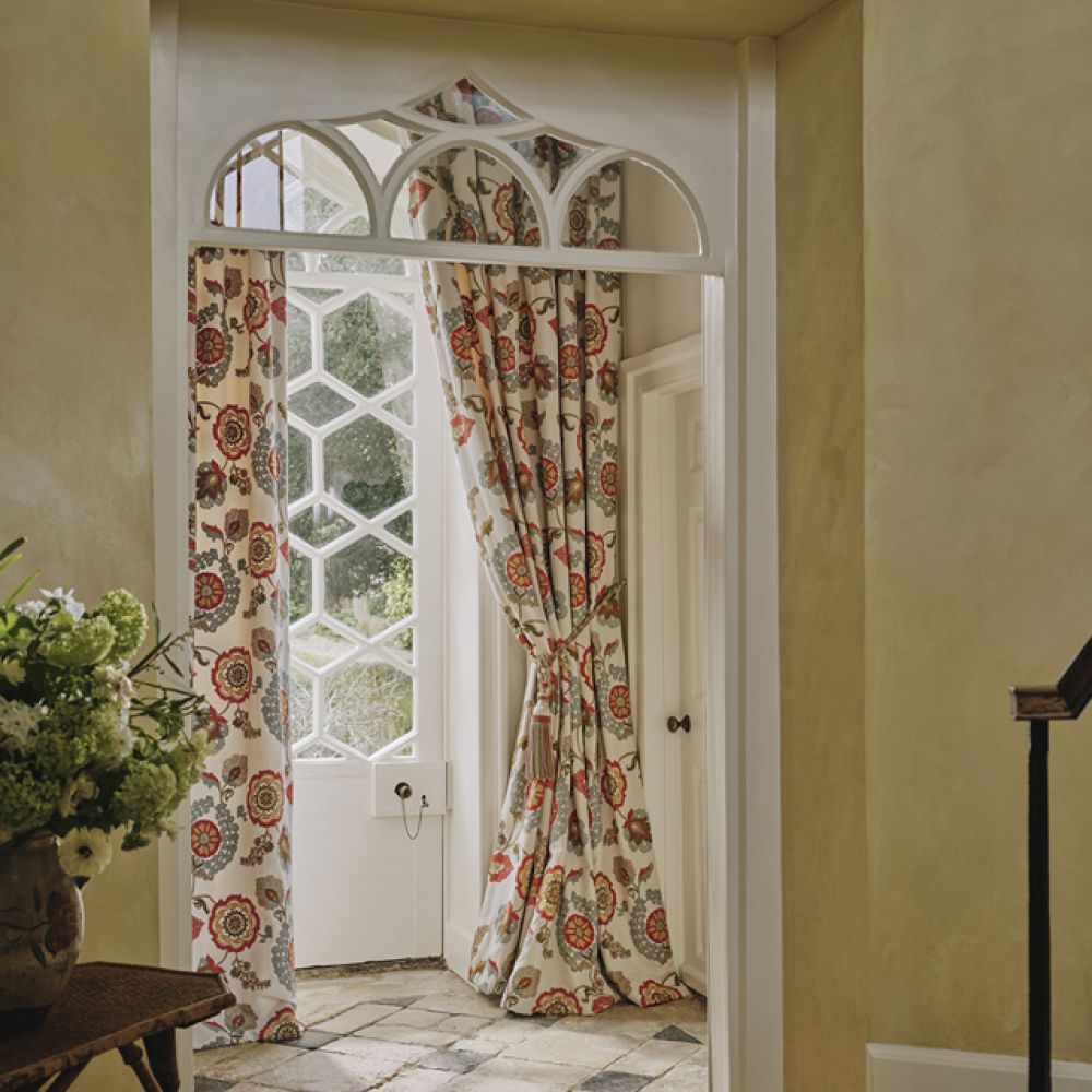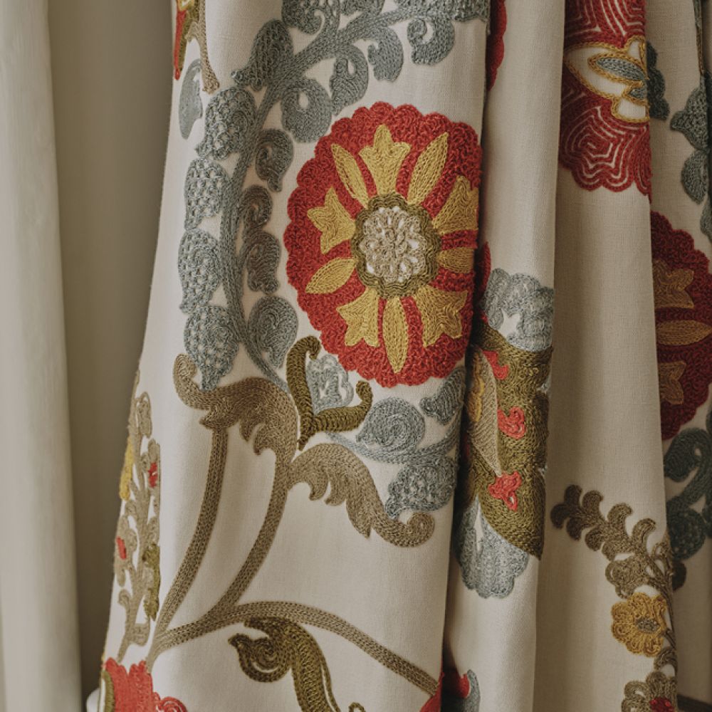 Вдохновившись орнаментальными узорами традиционных сузанийских тканей, Оландер представляет новую интерпретацию этого знаменитого стиля вышивки в виде плавной дорожки, выполненной в технике «в елочку». Крупный масштаб придает рисунку легкость, а яркие цвета и богатая фактура цепного стежка придают поверхности глубину и объем.