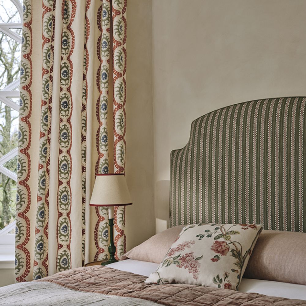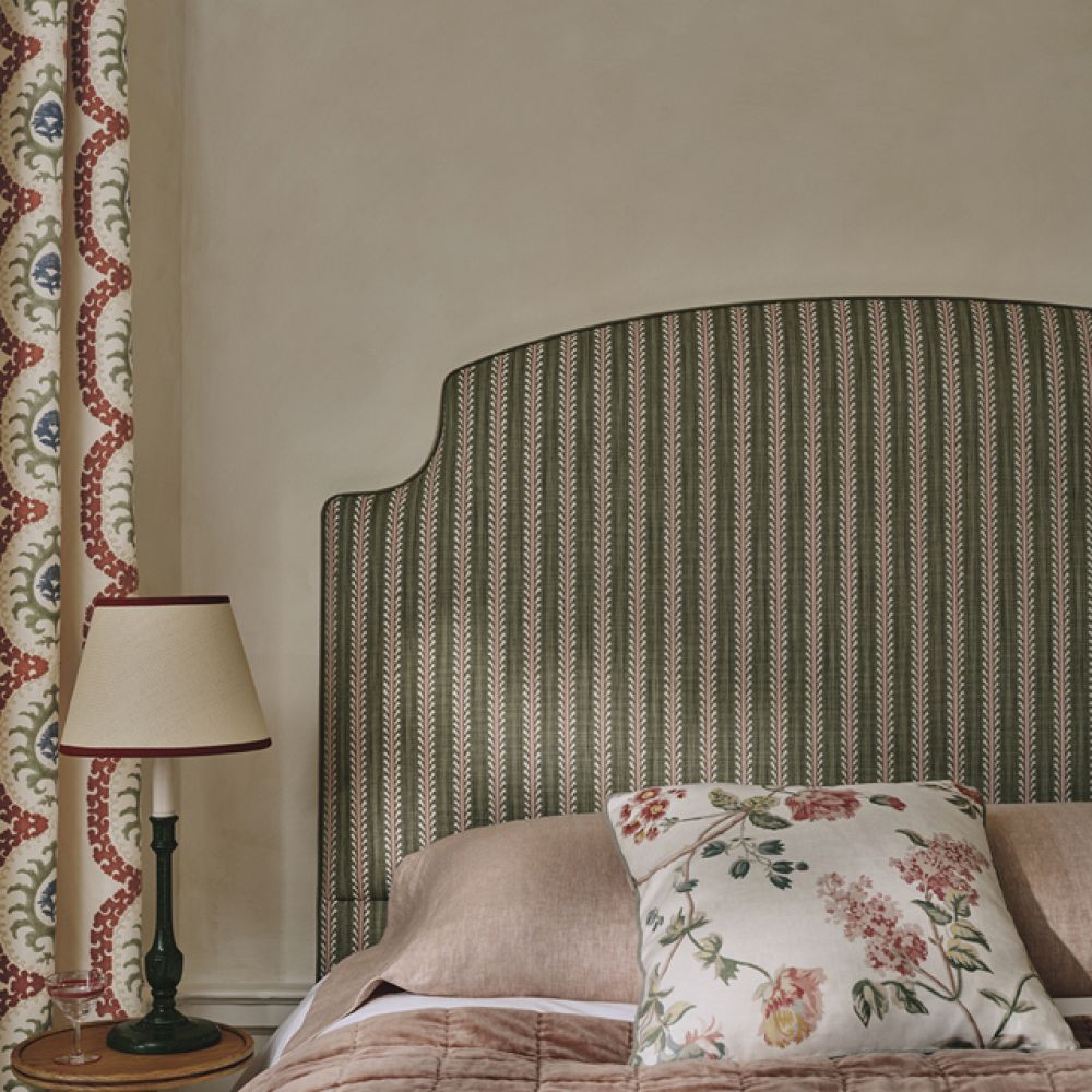 Коллекция Bourdon Stripe, вдохновленная фрагментом шелкового платья XVIII века, сочетает в себе продуманный графический ритм и замысловатые тканые детали. Плотная основа с едва заметным эффектом полосок придает ткани глубину и текстуру, а кремовый узор в виде птичьих крыльев, проступающий сквозь уток вокруг центральной полосы, придает изделию изысканный декоративный вид.
