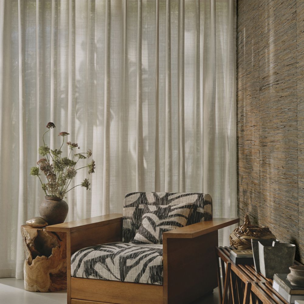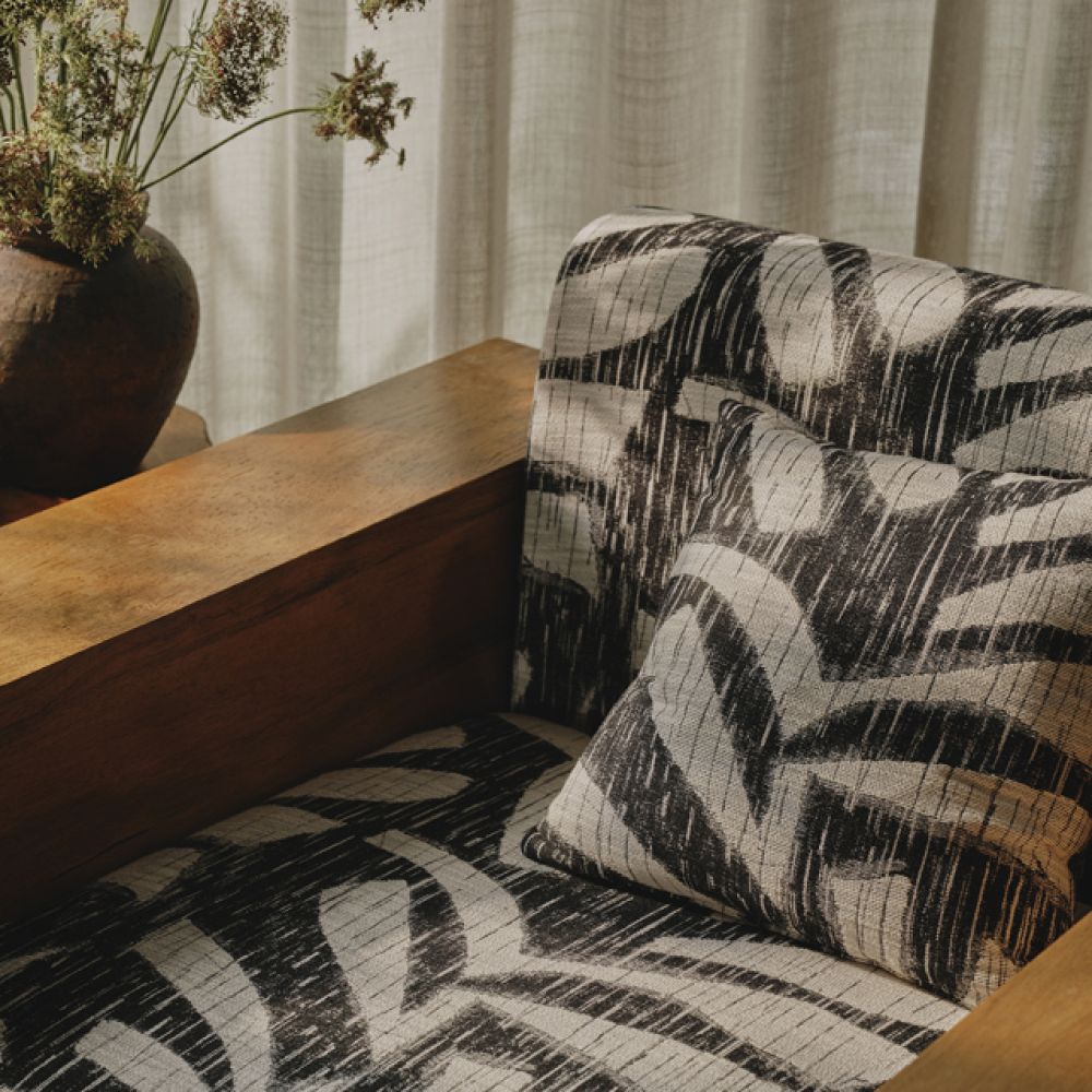 На мягкой ткани, напоминающей икат, сквозь контрастные текстуры проступает абстрактный мотив в виде листьев. Этот жаккард с его гибкими складками и изящной драпировкой передает ощущение естественной элегантности.