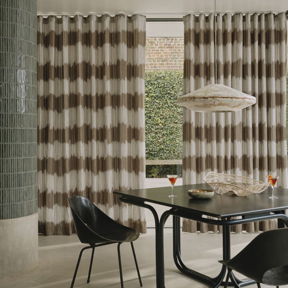 На мягком, сдержанном фоне переплетенные полосы, расположенные на разном расстоянии друг от друга, образуют замысловатый узор. Структура, выполненная в двух оттенках, усиливает ощущение глубины и движения. В результате получается эффектный скульптурный текстиль, в котором объемное плетение создает яркую поверхность, которая красиво переливается при смене освещения.