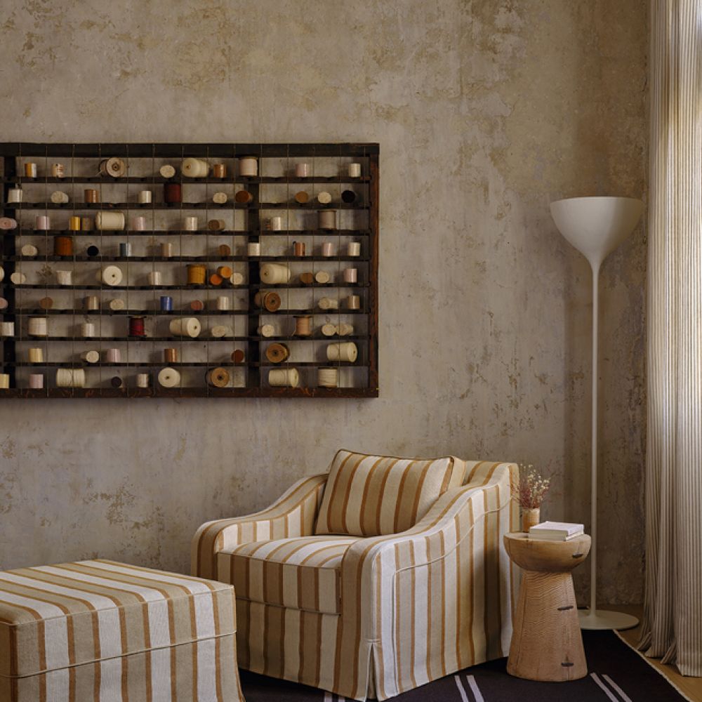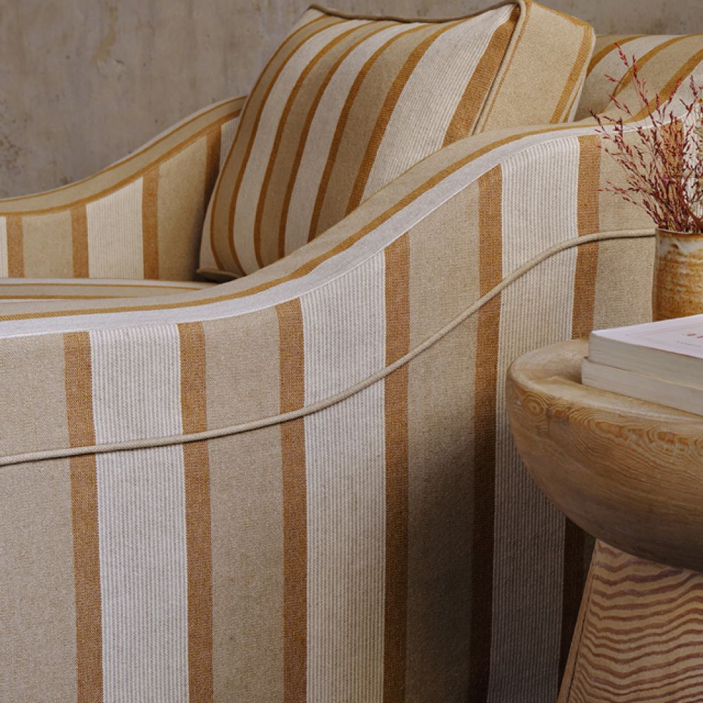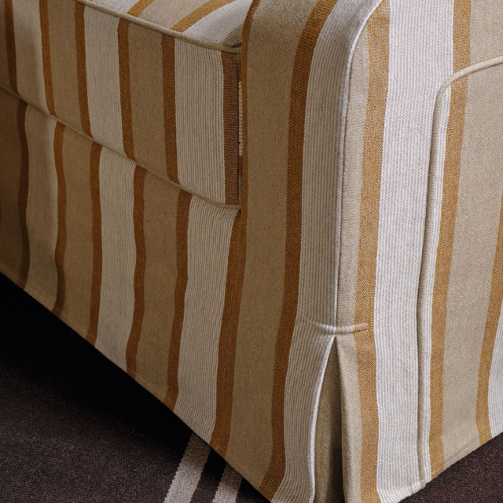 Благодаря универсальному среднему размеру эта модель прекрасно впишется в интерьер в переходном стиле. Чередование ярких полос с нейтральными полосками в тонкую нитку создает идеальный баланс между яркостью и изысканностью. При ближайшем рассмотрении можно заметить едва заметные контрасты основы и утка в оттенках камуфляжа, которые придают цвету глубину и насыщенность.