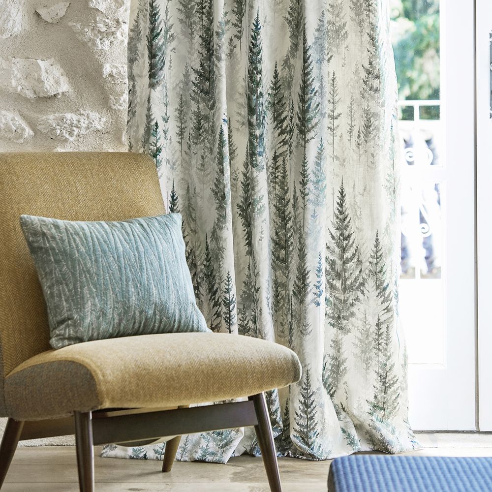 Этот дизайн ткани, вдохновленный японскими акварельными работами, изначально был выполнен водянистыми чернилами, чтобы передать рассеянный туман, нависающий над древними лесами. Хвойный лес то появляется, то исчезает в дизайне, переливаясь разноцветными пятнами света.